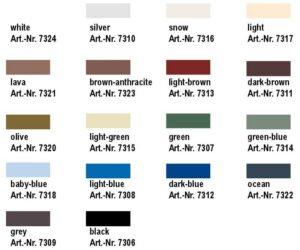 | Kleur | Black, Green, Light Blue, Grey, Silver, Dark Brown, Dark Blue, Light Brown, Green Blue, Light Green, Snow, Light, Baby Blue, Olive, Lava, Ocean, Brown Anthracite, White |