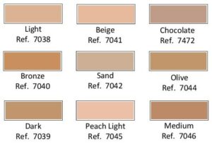 | Kleur | Light, Dark, Bronze, Beige, Sand, Chocolate, Olive, Peach-Light, Medium |
