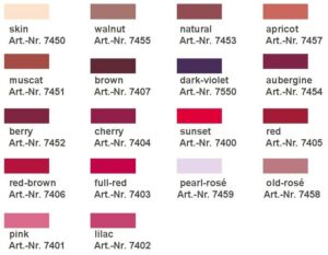 | Couleur | Sunset, Pink, Lilac, Full-Red, Cherry, Red, Red-Brown, Brown, Skin, Muscat, Berry, Natural, Aubergine, Walnut, Apricot, Old-Rosé, Pearl-Rosé, Dark-Violet |